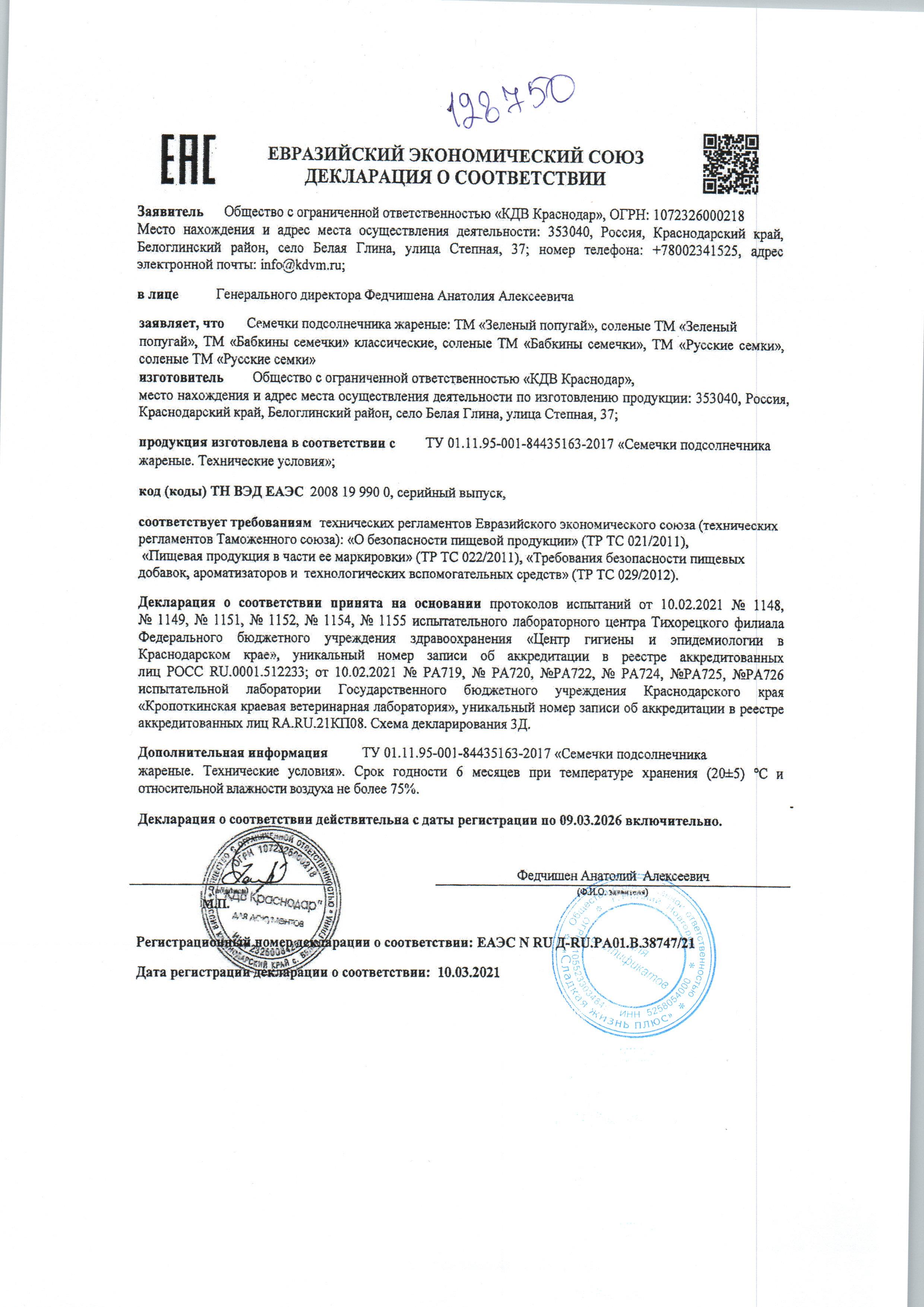 Семечки подсолнечника жареные по-домашнему соленые "Бабкины семечки". Для производства используются отборные семена. Чтобы максимально сохранить полезные свойства и вкусовые качества семечек, являющихся кладезем витаминов и аминокислот, используется щадящая технология обжарки в подсолнечном масле высшего качества. С небольшим добавлением морской соли.