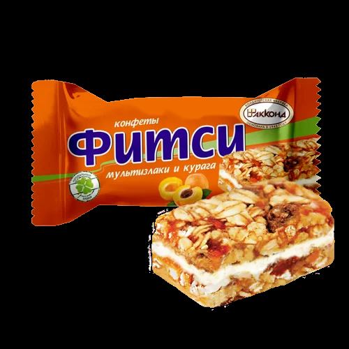 Зерновые конфеты на основе злаков и воздушного риса в натуральном яблочном пюре с кусочками кураги.