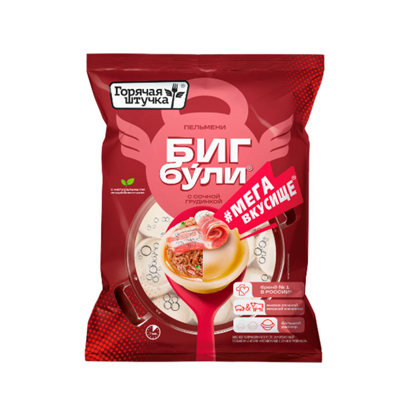 Пельмени Бигбули Мегавкусище — это мощный вкус, который заставляет возвращаться снова и снова. Сочная грудинка внутри каждой штучки даёт ощущение настоящего домашнего блюда. Идеально подходят для тех,