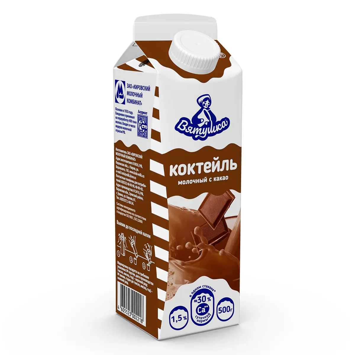 Коктейль с какао 1,5% вырабатывается из натурального молока с добавлением какао-порошка и подсластителя.