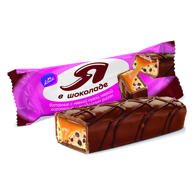 Конфеты Батончик Я в шоколаде с мягкой нугой, мягкой карамелью и воздуш рисом /4кг Конти