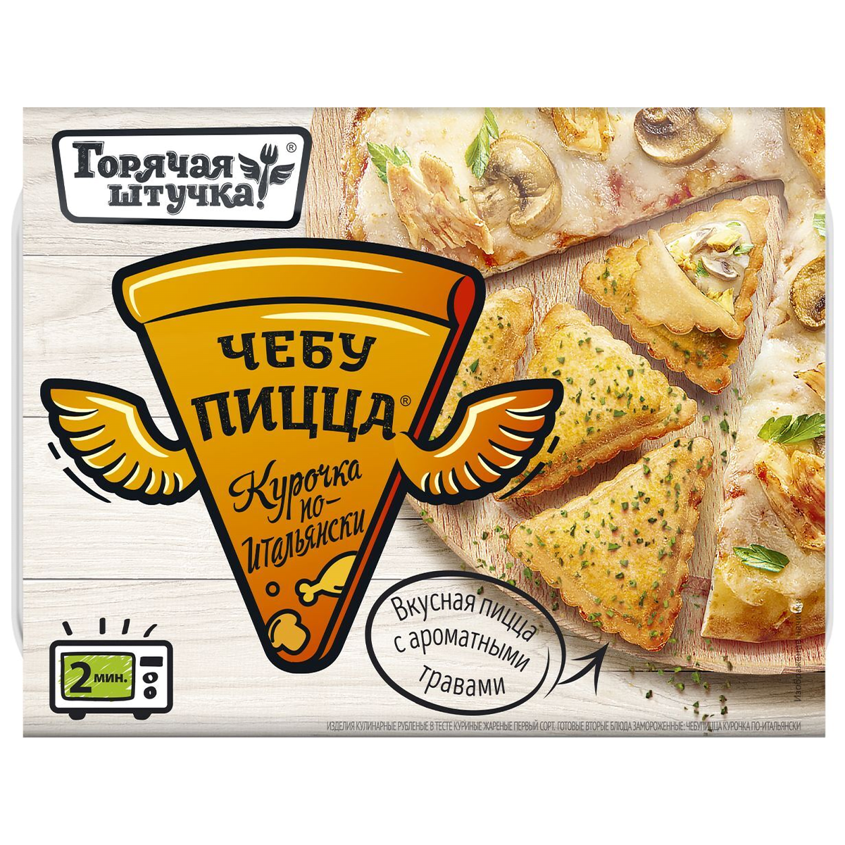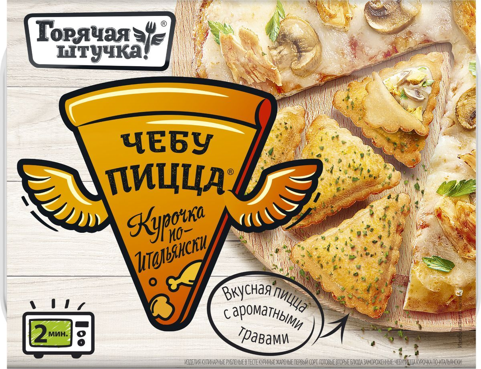 Чебупицца Курочка по-итальянски – это замороженный полуфабрикат, на приготовление которого у вас уйдёт всего несколько минут. Готовится она в микроволновке, готовое блюдо получается нежным и ароматным. Это нечто среднее между чебуреками и пиццей. Внутри тонкого теста начинка из курицы, тянущегося сыра и ароматных специй. По вкусу чем-то напоминает итальянские закрытые пиццы кальцоне.